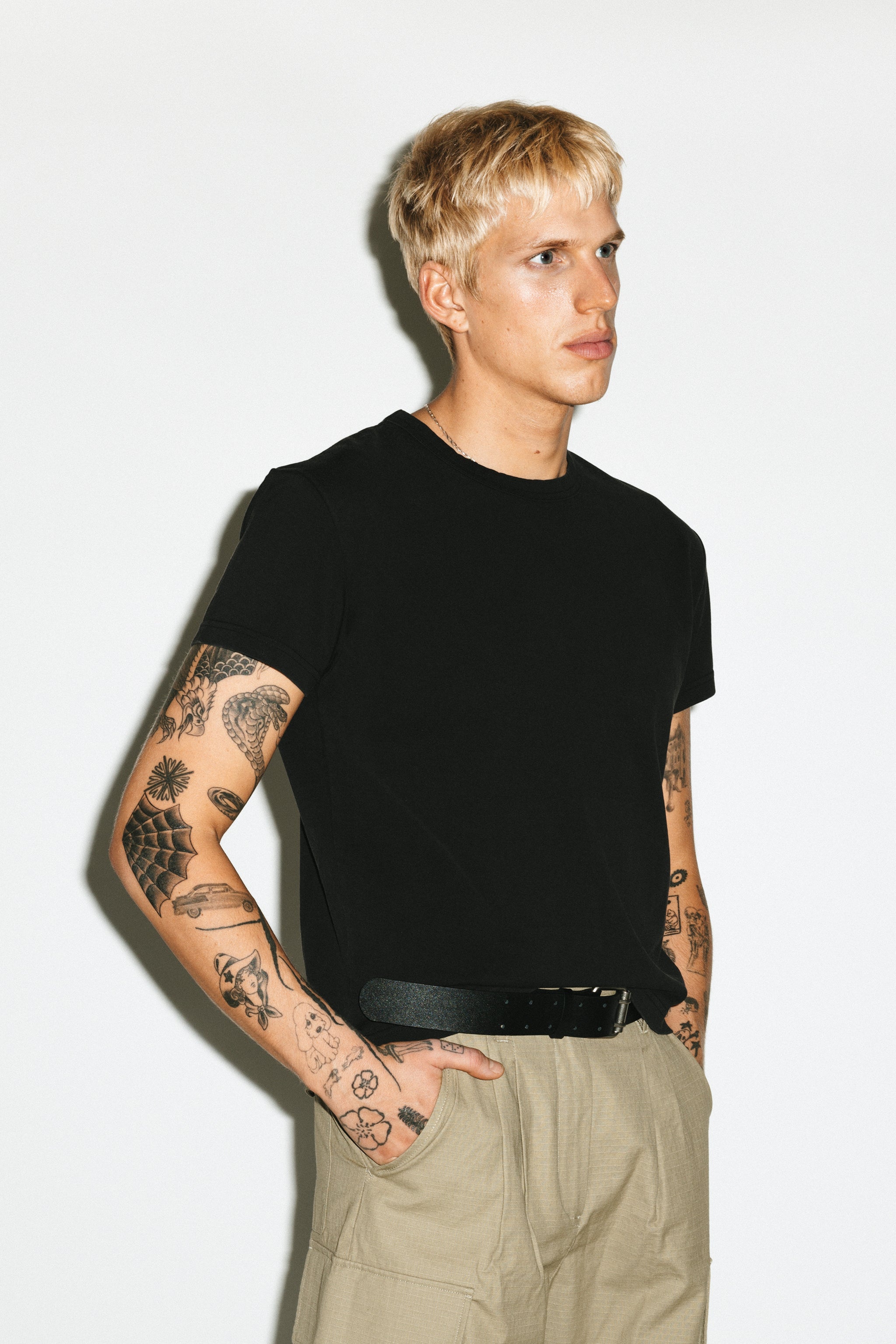 A suede leather belt with western inspired silver hardware. Adorned with a brushed silver horseshoe buckle, double solid silver belt loops and a pointed silver tip. A minimalist edge for the California cowboy.